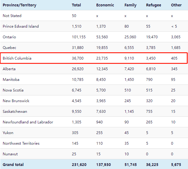 BC省经济类移民和家庭类移民排名第二,在其他移民中排名第三。