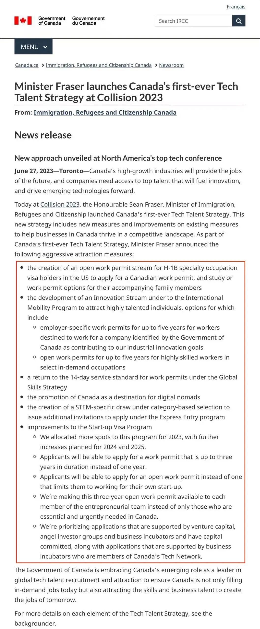 官方来源:Minister Fraser launches Canada’s first-ever Tech Talent Strategy at Collision 2023 - Canada.ca