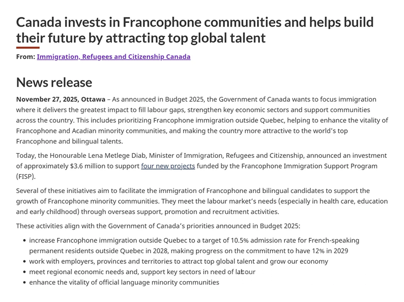 加拿大公布四项法语移民资助方案,深刻落实对其的重视!